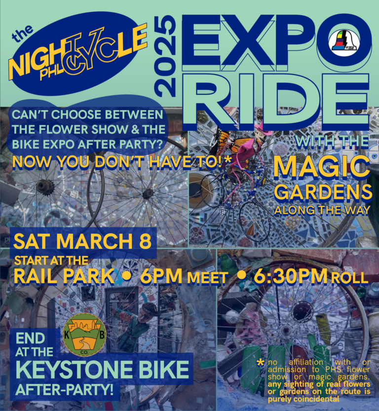 Saturday March 8th, Meet at the Rail Park at 6:00pm, Roll at 6:30pm Led by Cycle Scene PHL Meet at the Rail Park: On Noble Street, between Broad St and 13th Street, half a mile from the Convention Center. Use the address 1309 Noble Street for GPS routing. Our destination: Keystone Bike’s Expo After-Party. Don’t […]