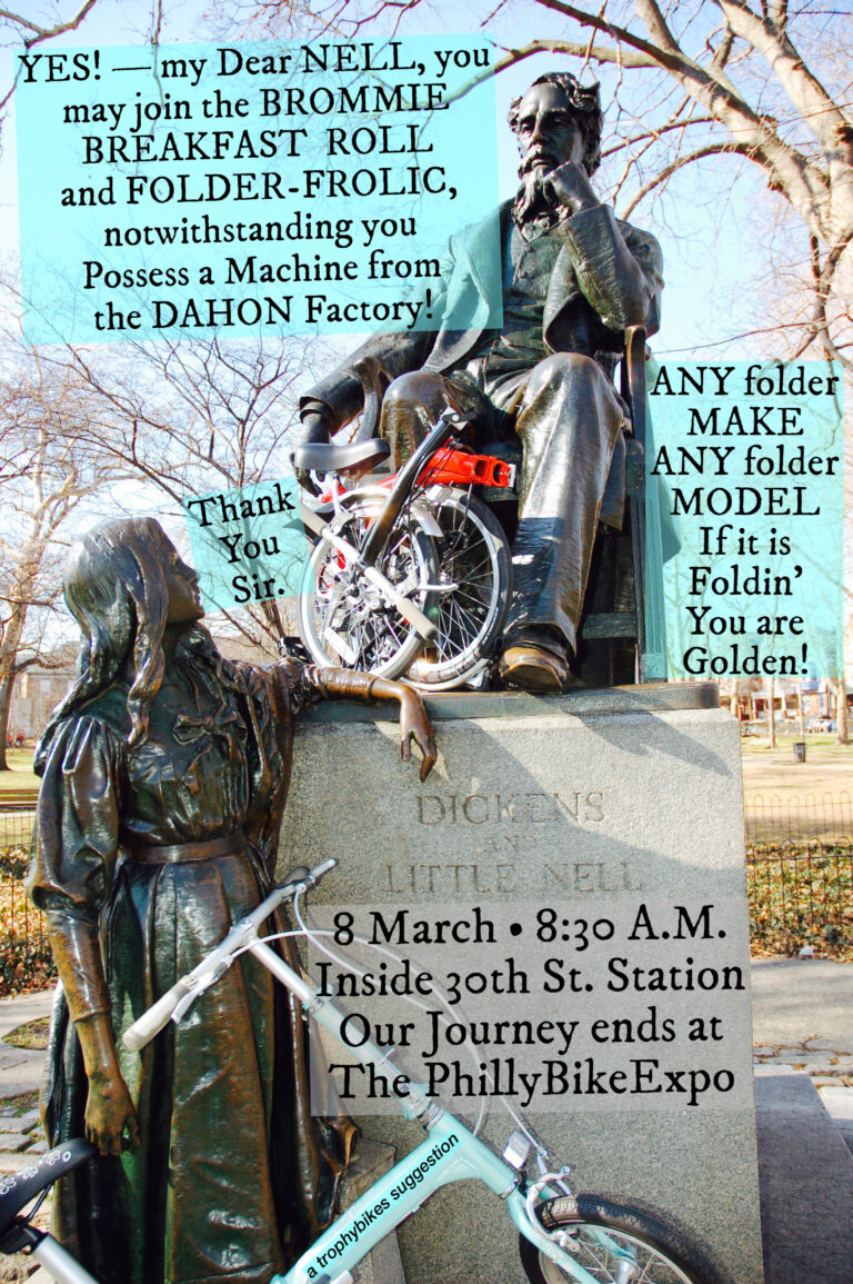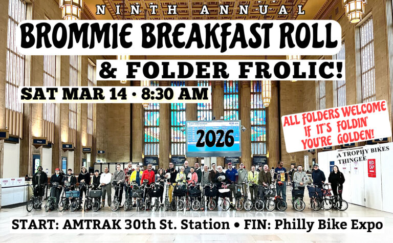 + FOLDER FROLIC (A “Brompton + Beyond” Ride*) *ALL FOLDERS WELCOME • ANY MAKE, ANY MODEL “If it’s FOLDIN’, You’re GOLDEN.” SAT. March 8, 8:30 a.m. Center Info Booth inside 30th Street Station, 30th + Market St. (optional) RAMP CLIMB + (required) Group Fold Foto. ENDS at the Philly Bike Expo, just about opening time. […]