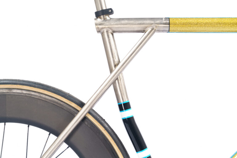 More recently, Johnny has come up with a neat front derailleur clip. “I built a frame with a drive-train in mind. Then halfway through, when the frame came back from the painter, I changed my mind. I saw a Suntour XCD derailleur, and I want those. But they’re only available with braze-on fittings. I didn’t have a braze-on tab on the bike, I hadn’t thought of that, I’d been thinking of something else. So, there’s an adapter you can buy with a clamp-on, but they don’t match my style and mostly they’re made for oversize tubes, I don’t have those, so you need a plastic shim, which if you’re not careful can kink your seat tube. So I made my own. I made a little hinge out of stainless steel, took some Columbus XCR stainless tubing and modified it a little. I like how the Campy clamp-on has a little delta shape, so I kind of copied that in a nod to the old Campy clamp-ons.