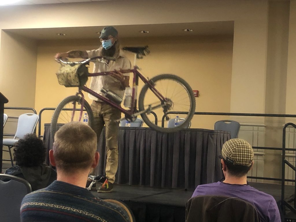The title of the talk refers to the recent decision by the Union Cycliste International (UCI) to offer a gravel world championships, but much of it was a lament for the loss of romance in backwoods trail exploration and a desire to return to the swashbuckling days of mountain biking in its early days. Several video clips from the early mountain bike races in Marin County and Colorado with riders on what would now be described as “primitive” bikes putting them up on their shoulders and hiking up the steeper trail sections brought this home.